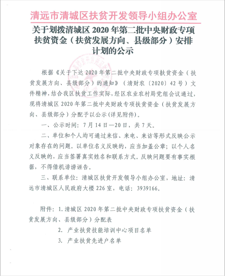 關于劃撥清城區2020年第二批中央財政專項扶貧資金(扶貧發展方向、縣級部分)安排計劃的公示
