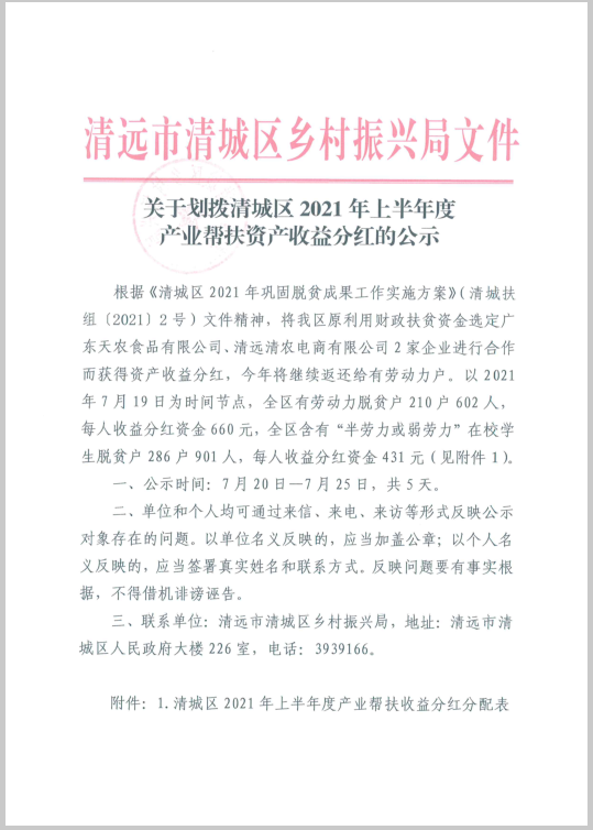 關于劃撥清城區2021年上半年度產業扶貧資產收益分紅的公示