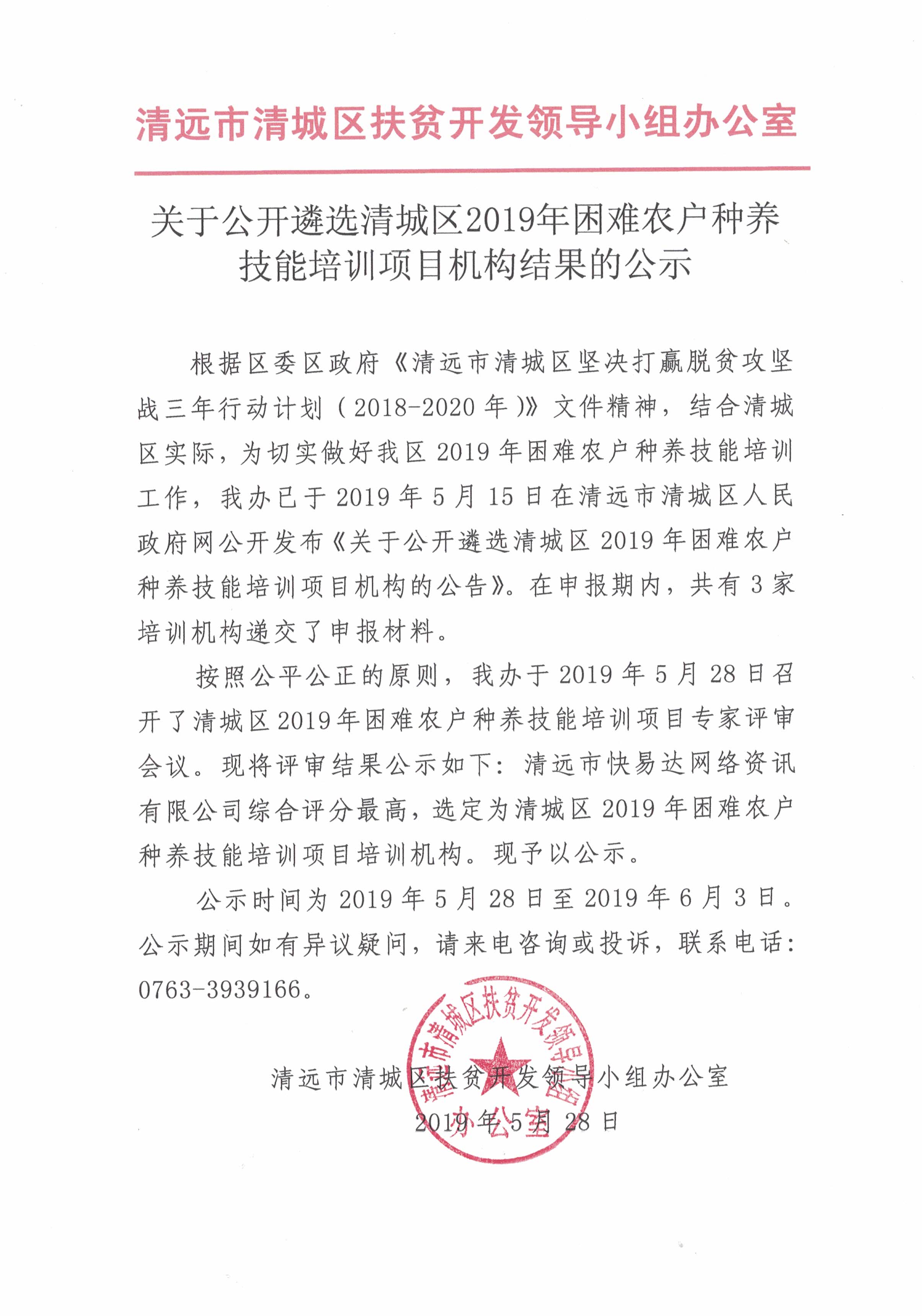 關于公開遴選清城區2019年困難農戶種養技能培訓項目機構結果的公示