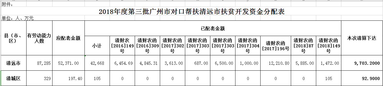 根據清財農函【2018】172號文,廣州市下達我區2018年精準扶貧資金92.9萬元,現將資金公示如下: