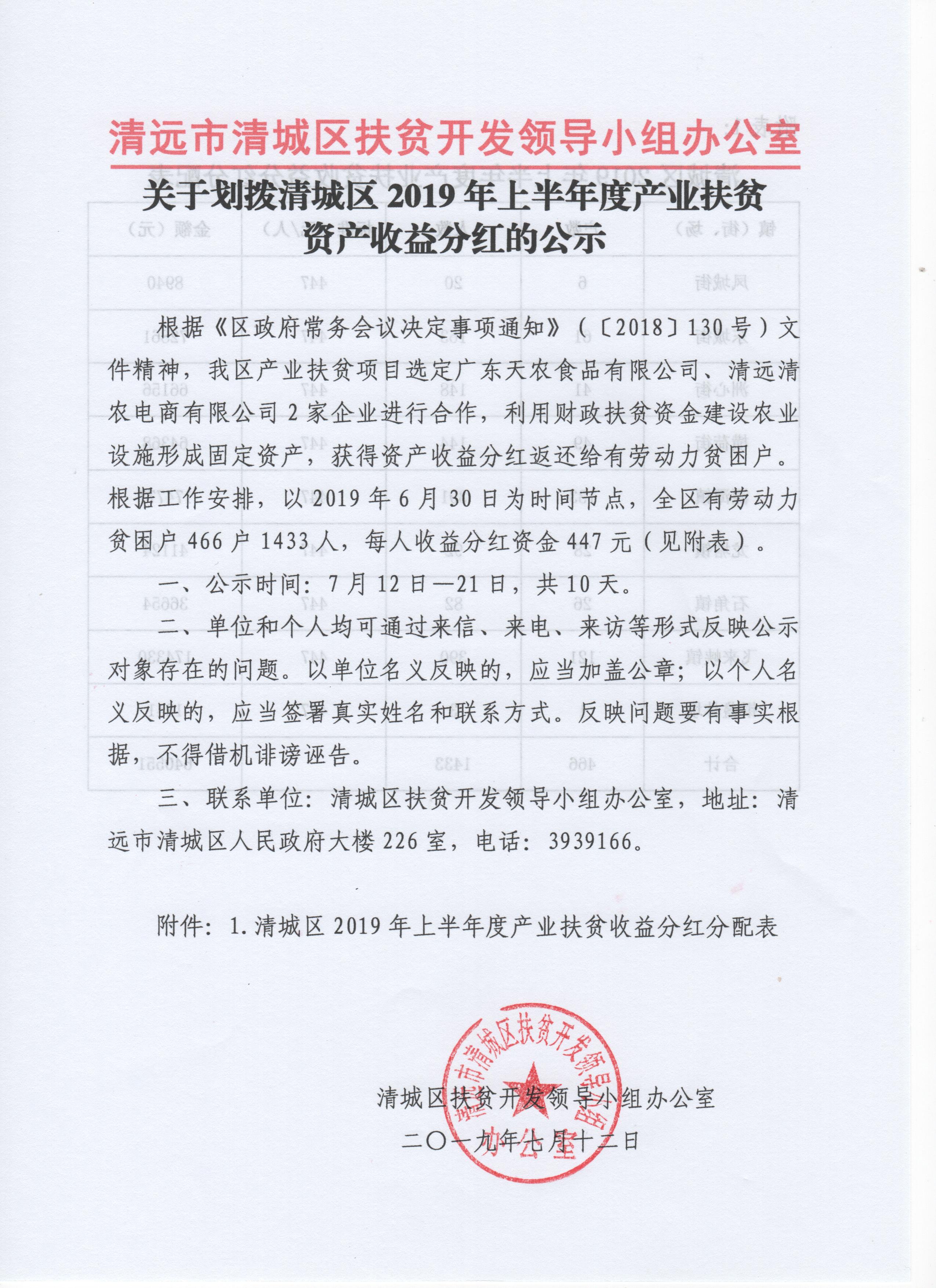 關(guān)于劃撥清城區(qū)2019年上半年度產(chǎn)業(yè)扶貧資產(chǎn)收益分紅的公示