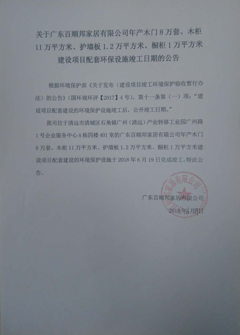 附件: 關于廣東百順邦家居有限公司年產木門8萬套、木柜11萬平方米、護墻板1.2萬平方米、櫥柜1萬平方米建設項目配套環保設施竣工日的公告.pdf