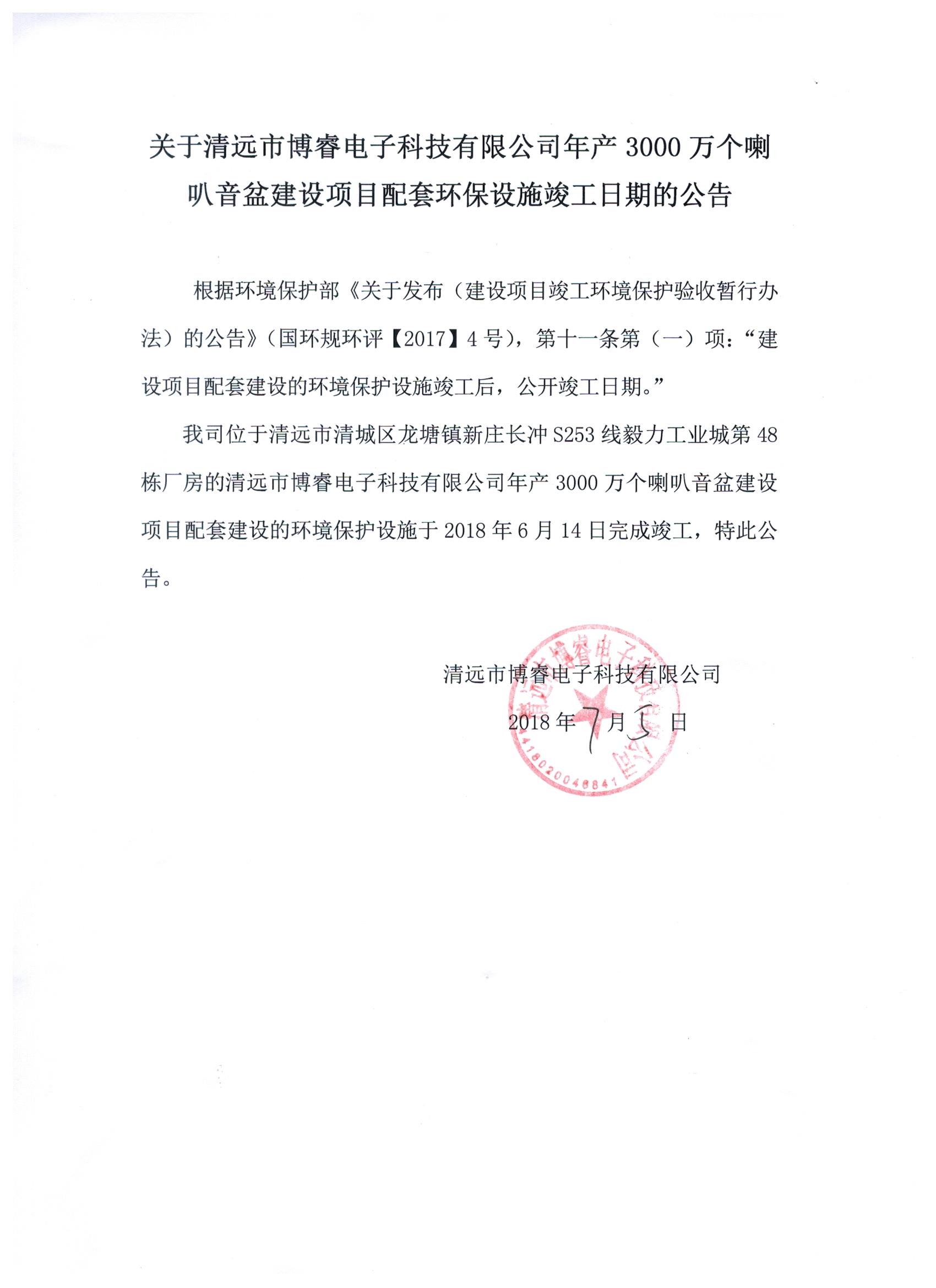 附件: 關于清遠市博睿電子科技有限公司年產3000萬個喇叭音盆建設項目配套環保設施竣工日期的公告.pdf