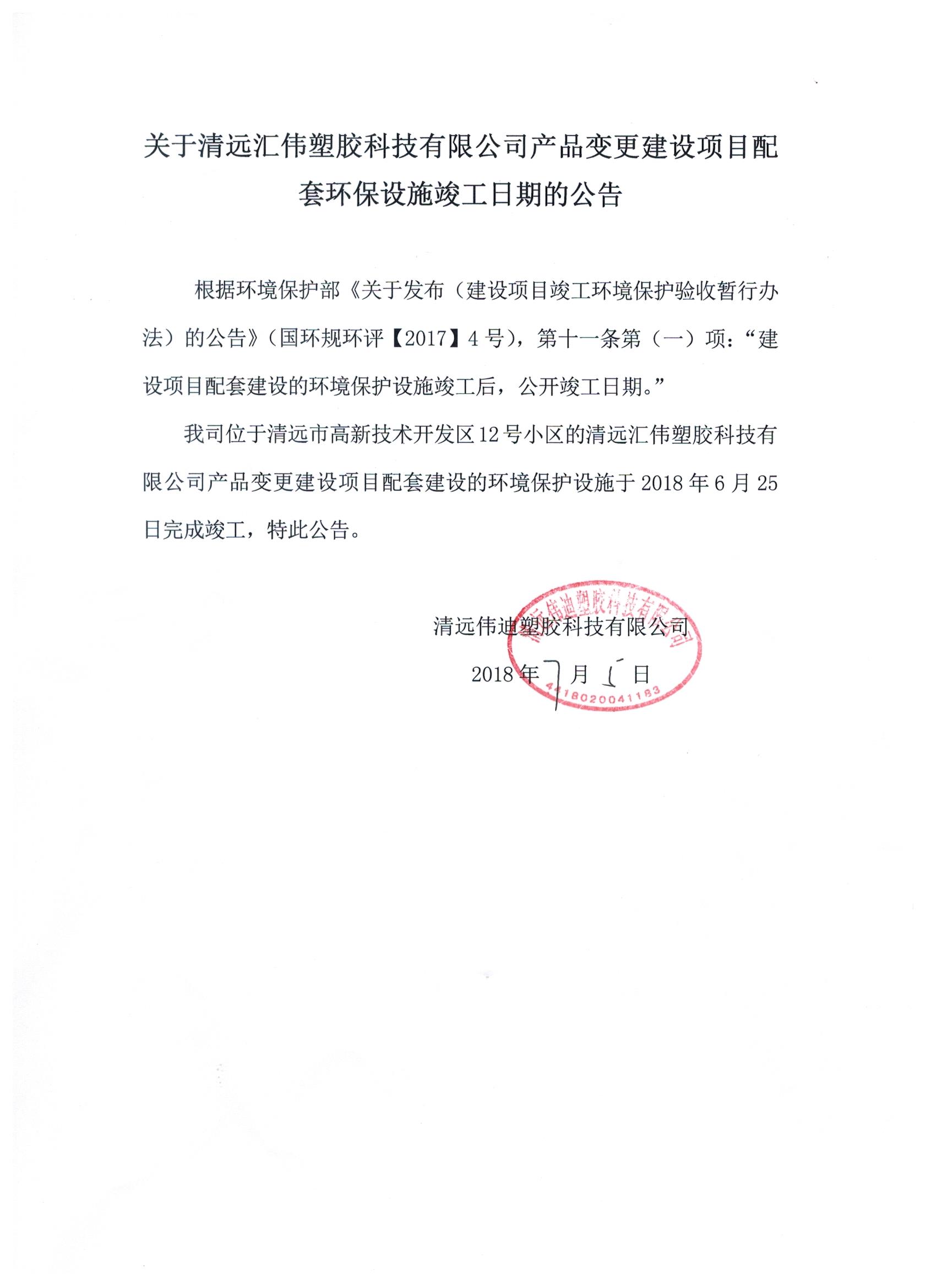 附件: 關于清遠匯偉塑膠科技有限公司產品變更建設項目配套環保設施竣工日期的公告.pdf
