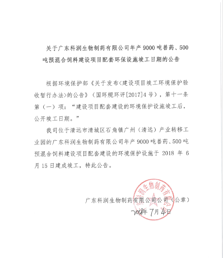 附件: 關于廣東科潤生物制藥有限公司年產9000噸獸藥、500噸預混合飼料建設項目配套環保設施竣工日期的公告.pdf