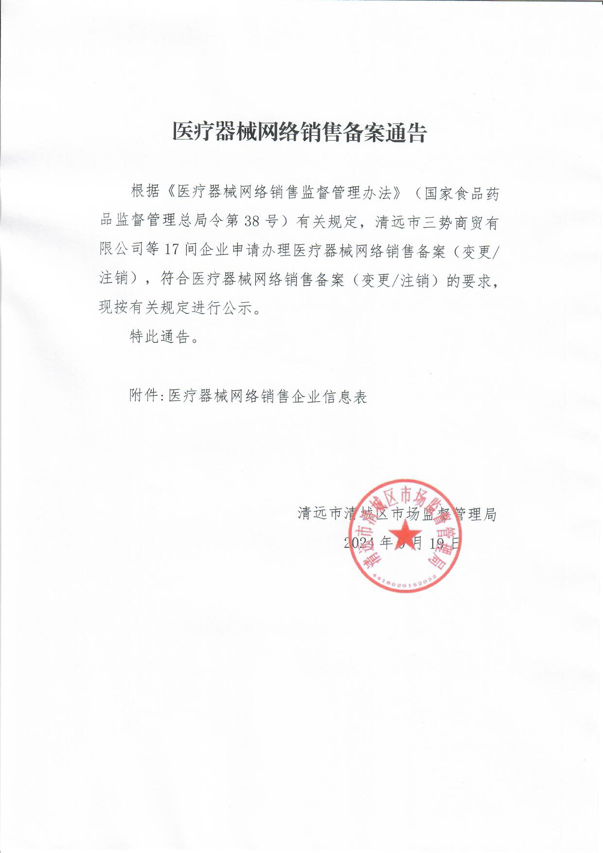 3 | 變更備案 | (清城)網(wǎng)械銷(xiāo)售備字 ﹝2024﹞第151號(hào) | 2024/9/18 | 廣東品健大藥房連鎖有限公司 | 入駐類(lèi) | 914418020553940005 | 清遠(yuǎn)市清城區(qū)東城長(zhǎng)埔長(zhǎng)東村實(shí)業(yè)用地商鋪后棟四樓C區(qū) | 清遠(yuǎn)市清城區(qū)東城長(zhǎng)埔長(zhǎng)東村實(shí)業(yè)用地商鋪后棟三樓D-1區(qū) | 天貓;藥店加;美團(tuán)網(wǎng);拼多多商城;京東商城 | (浙)網(wǎng)械平臺(tái)備字[2018]第00002號(hào);(瀘)網(wǎng)械平臺(tái)備【2020】第00011號(hào);(京)網(wǎng)械平臺(tái)備字(2018)第00004號(hào);(滬)網(wǎng)械平臺(tái)備字【2018】第00003號(hào);(京)網(wǎng)械平臺(tái)備字(2018)第00003號(hào) | ****** | ****** | ****** | ****** | ****** | ****** |