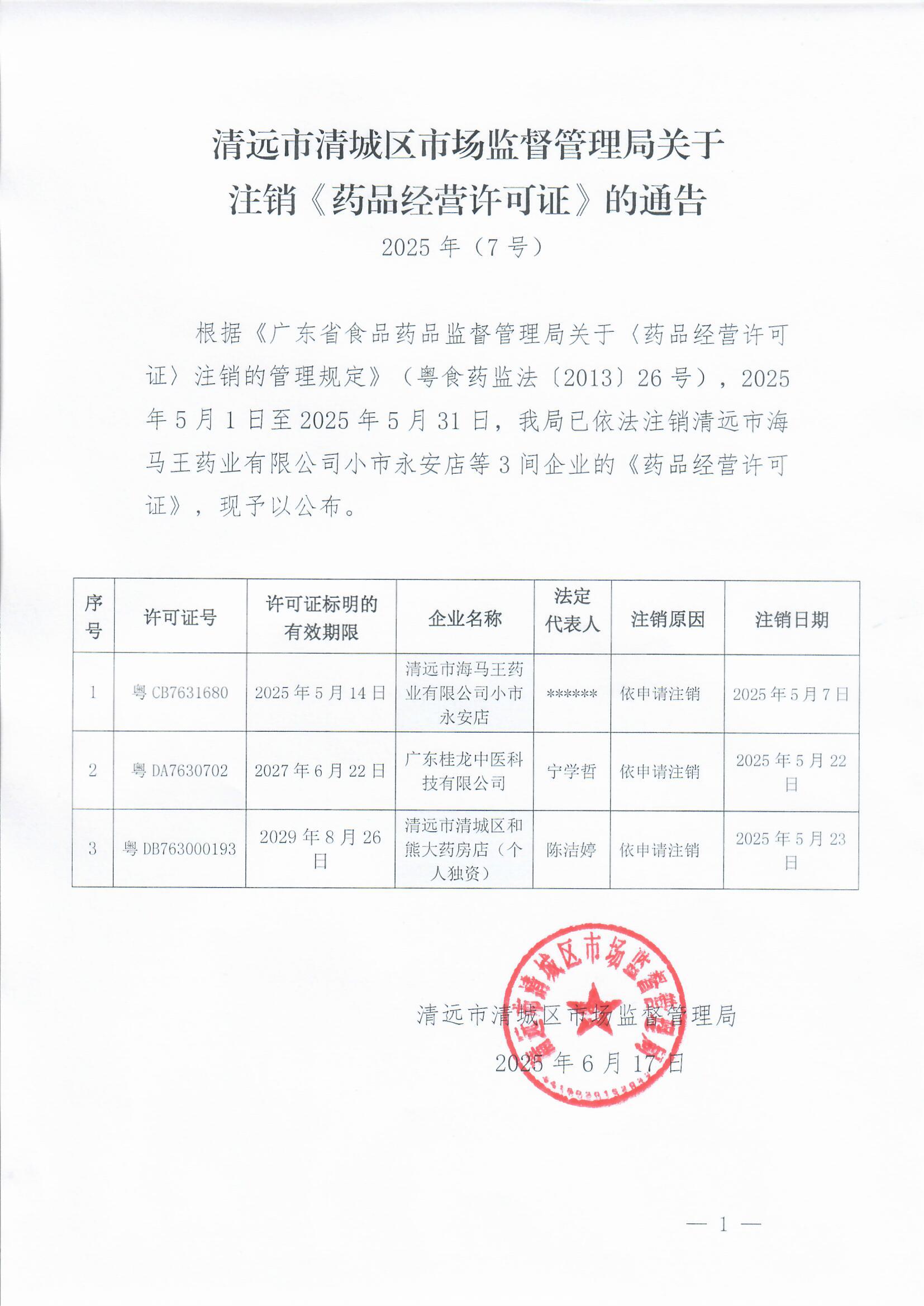清遠市清城區市場監督管理局關于注銷《藥品經營許可證》的通告(2025年(7號))