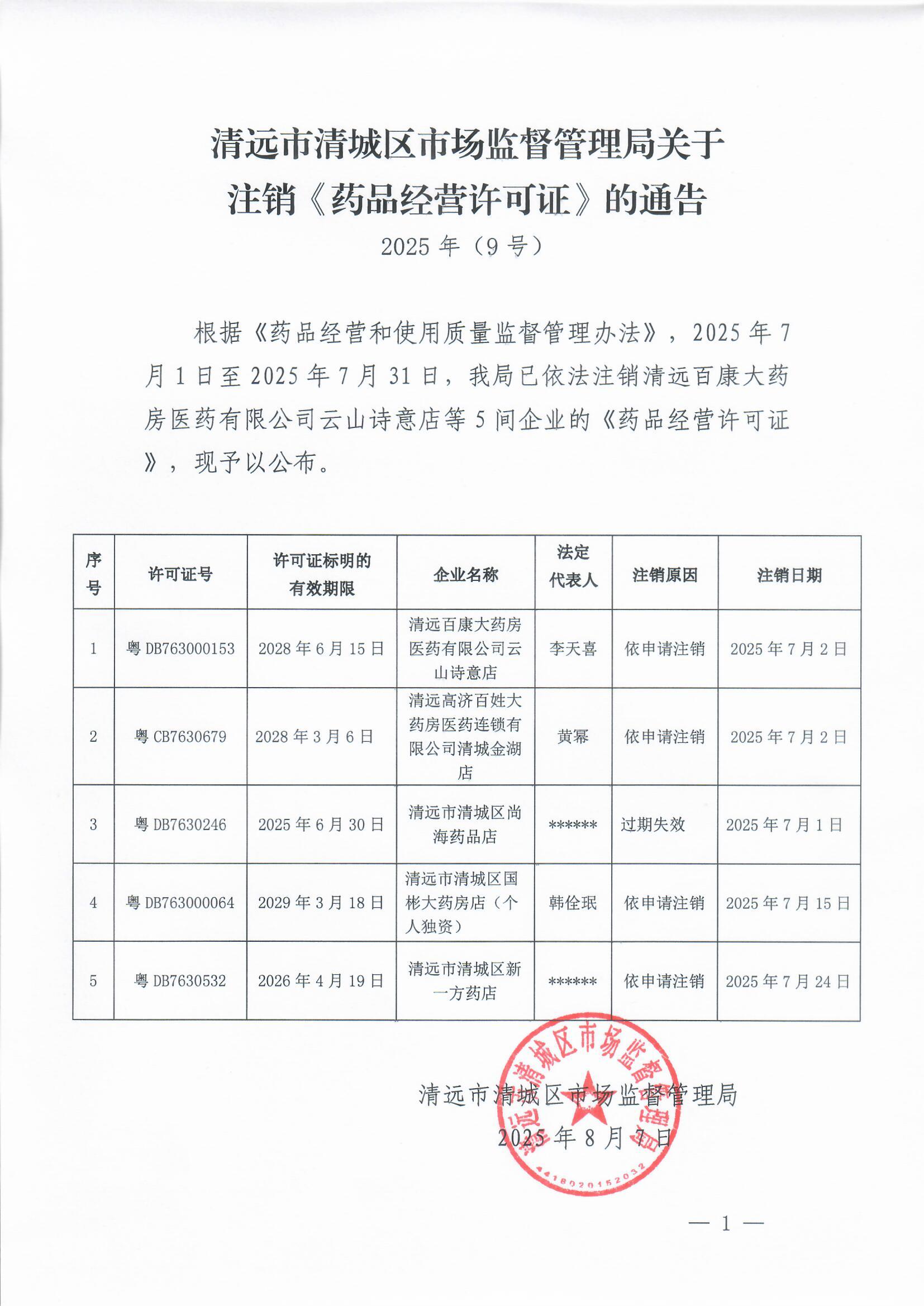 清遠(yuǎn)市清城區(qū)市場(chǎng)監(jiān)督管理局關(guān)于注銷《藥品經(jīng)營(yíng)許可證》的通告