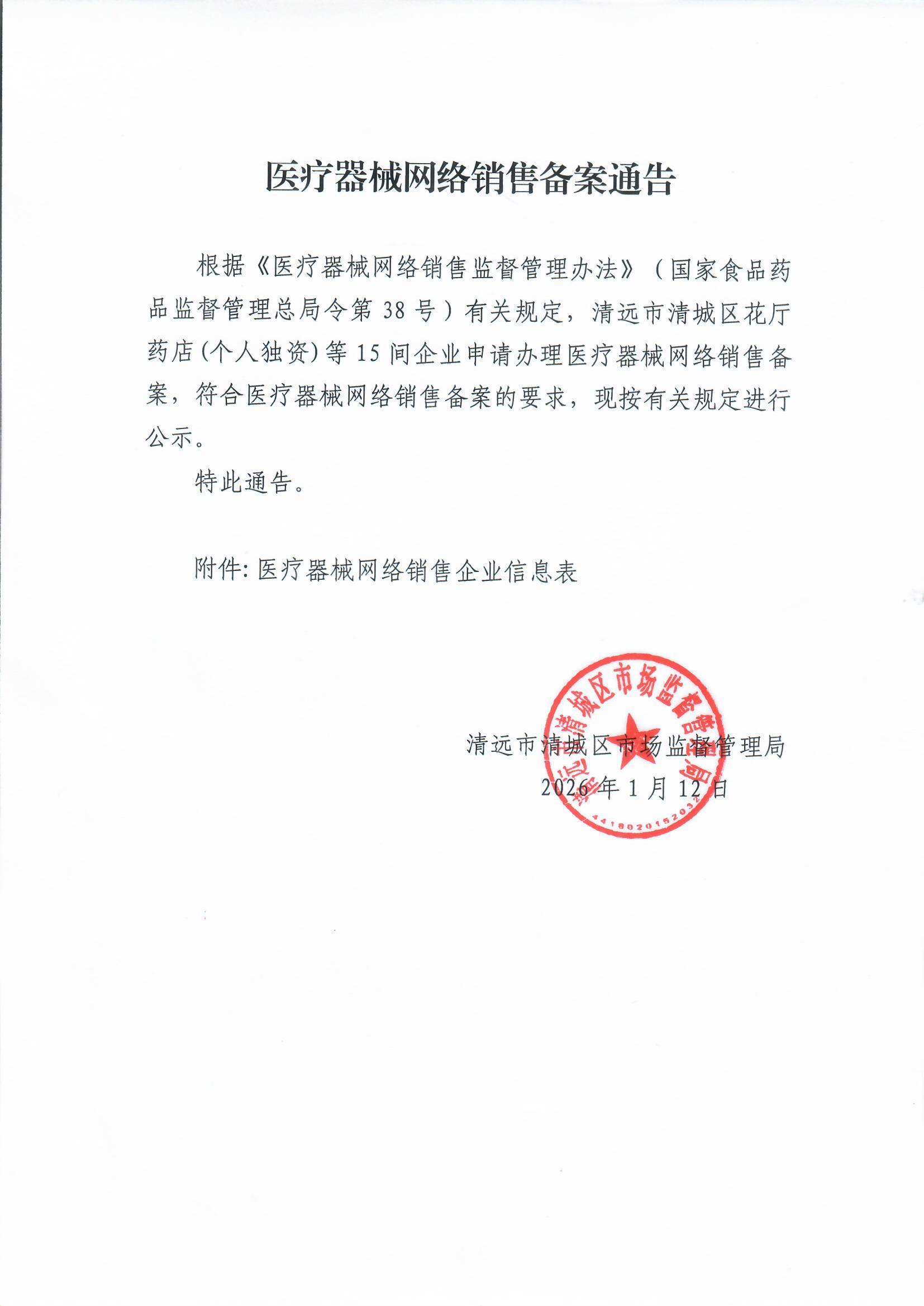 1 | 首次備案 | (清城)網械銷售備字 ﹝2025﹞第49號 | 2025/12/5 | 清遠市清城區花廳藥店(個人獨資) | 入駐類 | 91441802MAE6L77L8D | 清遠市清城區羅宅街一巷一座之一首層 | ****** | 抖店、抖音電商;京東到家;餓了么;美團網;拼多多商城;天貓 | (滬)網械平臺備字[2022]第 00002 號;(滬)網械平臺備字[2018]第 00002 號;(滬)網械平臺備字[2018]第 00004 號;(京)網械平臺備字(2018)第 00004 號;(滬)網械平臺備字[2018]第 00003 號;(浙)網械平臺備字[2018]第 00002 號 | 無 | 無 | 無 | 無 | 無 | 無 |