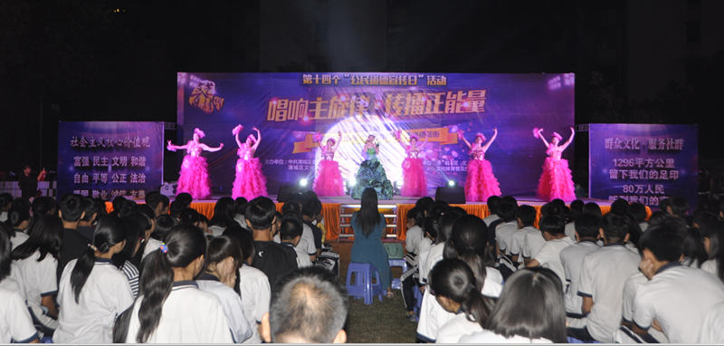 9月20日晚,清城區2016年“文藝百村行”橫荷街校園場暨全國第十四個公民道德宣傳日活動在橫荷中學舉辦,本次活動以“唱響主旋律,傳播正能量”為主題,精彩絕倫的節目及一系列有關公民道德宣傳的文藝匯演獲廣大師生的一致好評!