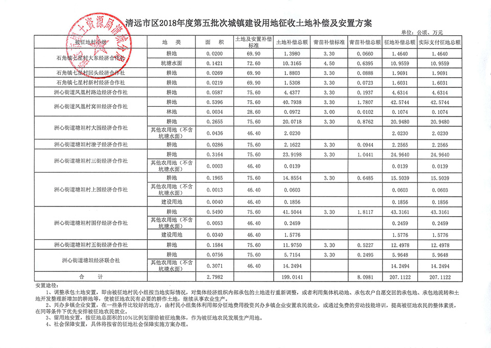 清遠市區2018年度第五批次城鎮建設用地征地補償安置方案