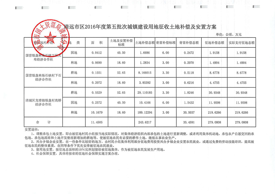 清遠市區(qū)2016年第五批次征地補償安置方案