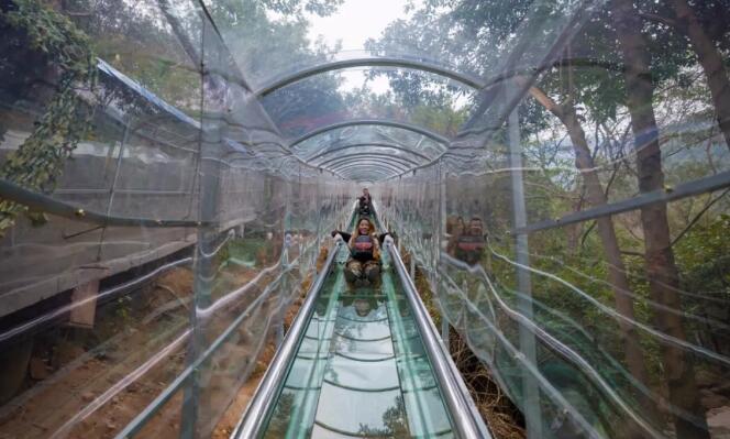 此全玻璃打造的滑道是廣東第一座,全長(zhǎng)480米。游客穿上特制的滑墊褲,在近乎70度的垂直坡度向下飛快劃去,滑道穿梭在牛魚(yú)嘴的原始森林里,就像進(jìn)入一個(gè)秘密森林隧道,深邃而刺激!