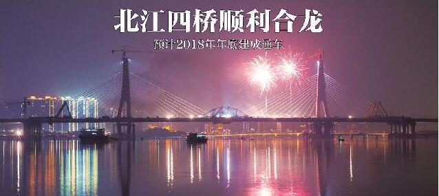 昨日凌晨1點45分,隨著最后一片鋼箱梁的吊裝完成,市區北江四橋主橋順利實現南北合龍。大橋合龍后將在春節后轉入橋面鋪裝、護欄、照明等施工階段,計劃在2018年年底前完成全橋荷載試驗和交工驗收后正式通車。