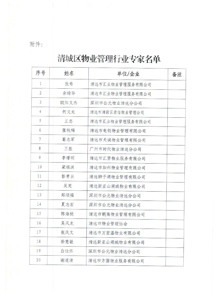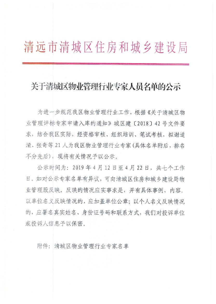 關(guān)于清城區(qū)物業(yè)管理行業(yè)專家人員名單的公示