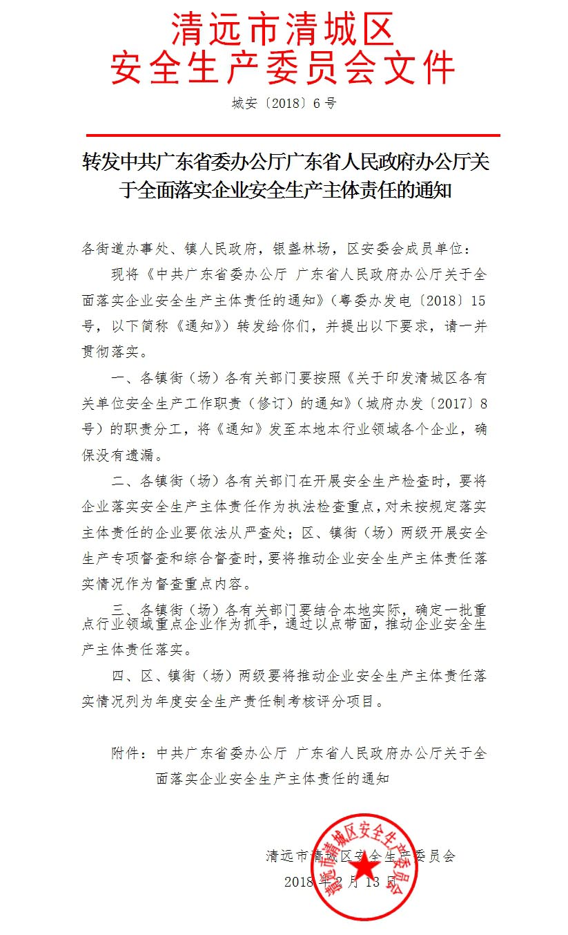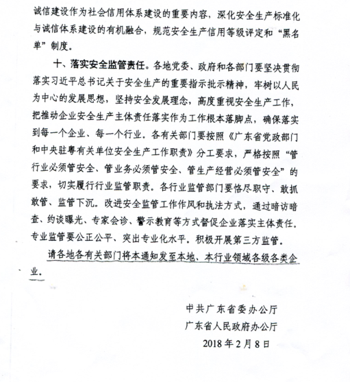 轉發中共廣東省委辦公廳廣東省人民政府辦公廳關于全面落實企業安全生產主體責任的通知