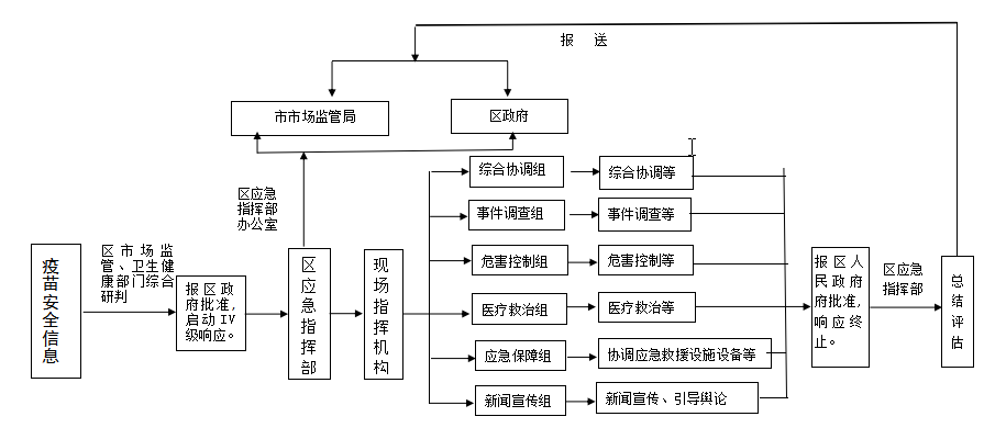發生一般疫苗安全事件,區市場監管局、區衛生健康局應及時請示區政府成立區應急指揮部,啟動Ⅳ級響應,并向上逐級報告事件處置情況。