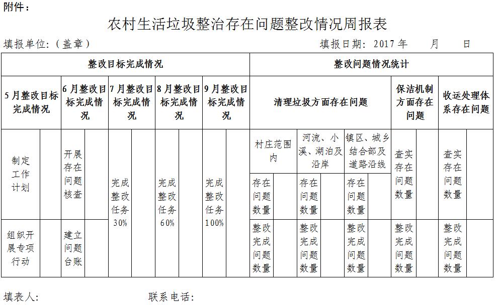 請各街鎮(場)按照自身工作進展情況填報《農村生活垃圾整治存在問題整改情況周報表》(見附件),并在每周星期五下午下班前,通過OA辦公系統,將加具單位公章的報送資料電子版報送至區城綜局,由區城綜局匯總上報至市住建局。各街鎮(場)請6月5日前將本單位信息報送聯絡員和分管領導名單報至區城綜局。