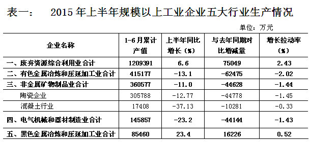 2015年是“十二五”規劃的收官之年,是能否完成規劃目標的關鍵一年,面對當前宏觀經濟下行壓力不斷加大、國內外市場需求持續疲軟和節能減排制約等諸多不利因素影響,全區上下采取各種措施力促工業經濟穩定發展。上半年規模以上工業企業生產總體保持平穩,但增速同比有所放緩。
