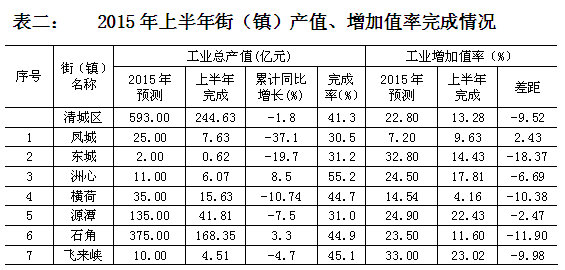 從街鎮指標完成情況看(見表二),規模以上工業產值僅完成年初預測的41.3%,有3個街鎮完成程度低于全區水平,其中鳳城完成30.5%,源潭完成31.0%,東城完成31.2%;有4個鎮街沒有完成上半年預測水平,其中源潭相差18.2億元,石角相差11.6億元,鳳城相差2.4億元,東城相差0.2億元。規模以上工業增加值率上半年僅為13.28%,雖然比一季度提高了0.95個百分點,但仍與年初預測相差9.52個百分點。全區只有鳳城增加值率高于年初預測2.43個百分點,其他6個街鎮均低于年初預測,其中產值占比大的石角鎮低于年初預測11.9個百分點;源潭低于年初預測2.47個百分點;橫荷低于年初預測10.38個百分點。