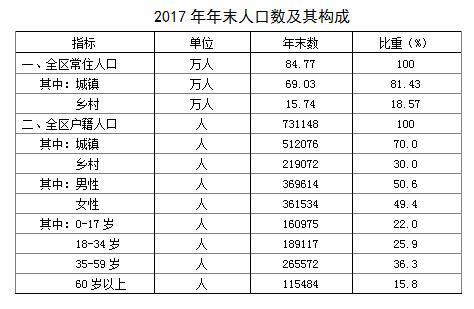 年末全區常住人口84.77萬人,比上年末增加0.33萬人,其中城鎮人口69.03萬人,占常住人口比重(常住人口城鎮化率)81.43%。全年人口出生率為15.68‰,死亡率為5.72‰,人口自然增長率為9.96‰。