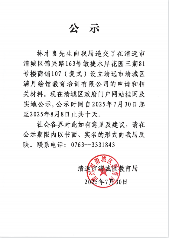 關于林才良先生申請設立清遠市清城區滿月繪館教育培訓有限公司的公示