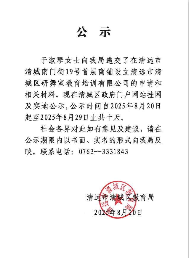 關于于淑琴女士申請設立清遠市清城區研舞室教育培訓有限公司的公示