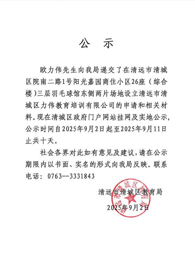 關于歐力偉先生申請設立清遠市清城區力偉教育培訓有限公司的公示
